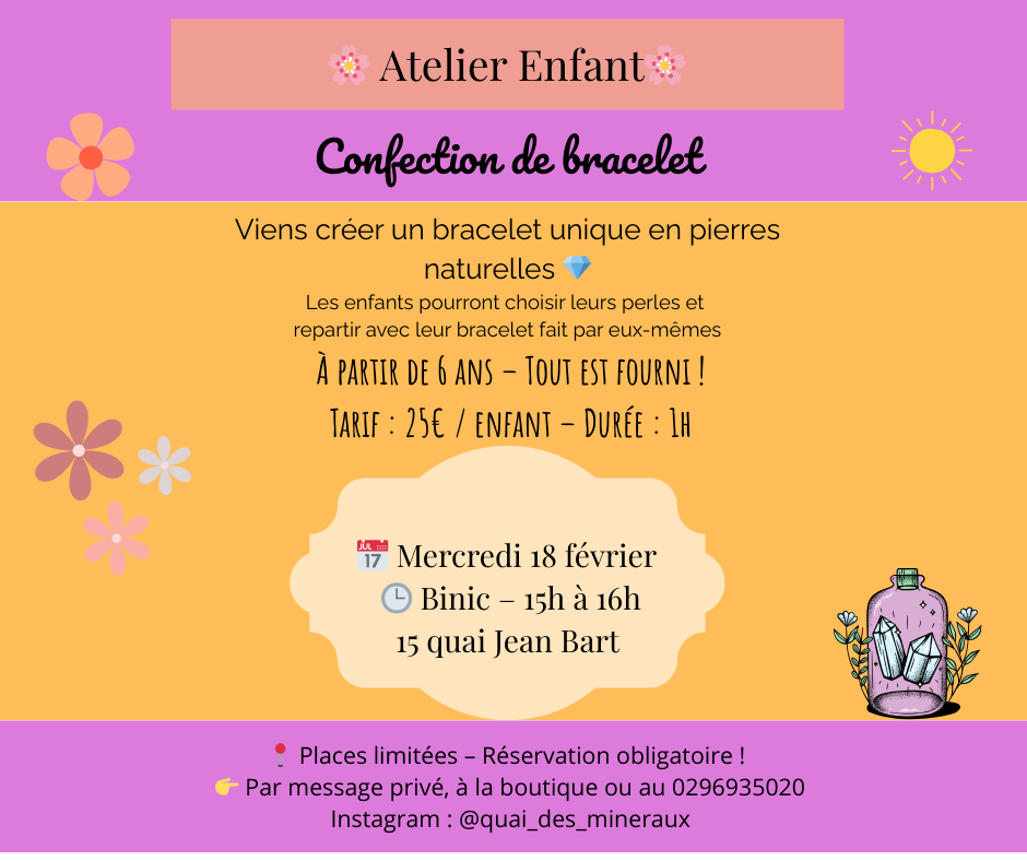 Une belle activité à faire pendant les vacances ! Un moment créatif et ludique pour les enfants : ils choisissent leurs perles et créent leur propre bracelet. Sur réservation par téléphone ou directement à la boutique. Places limitées.