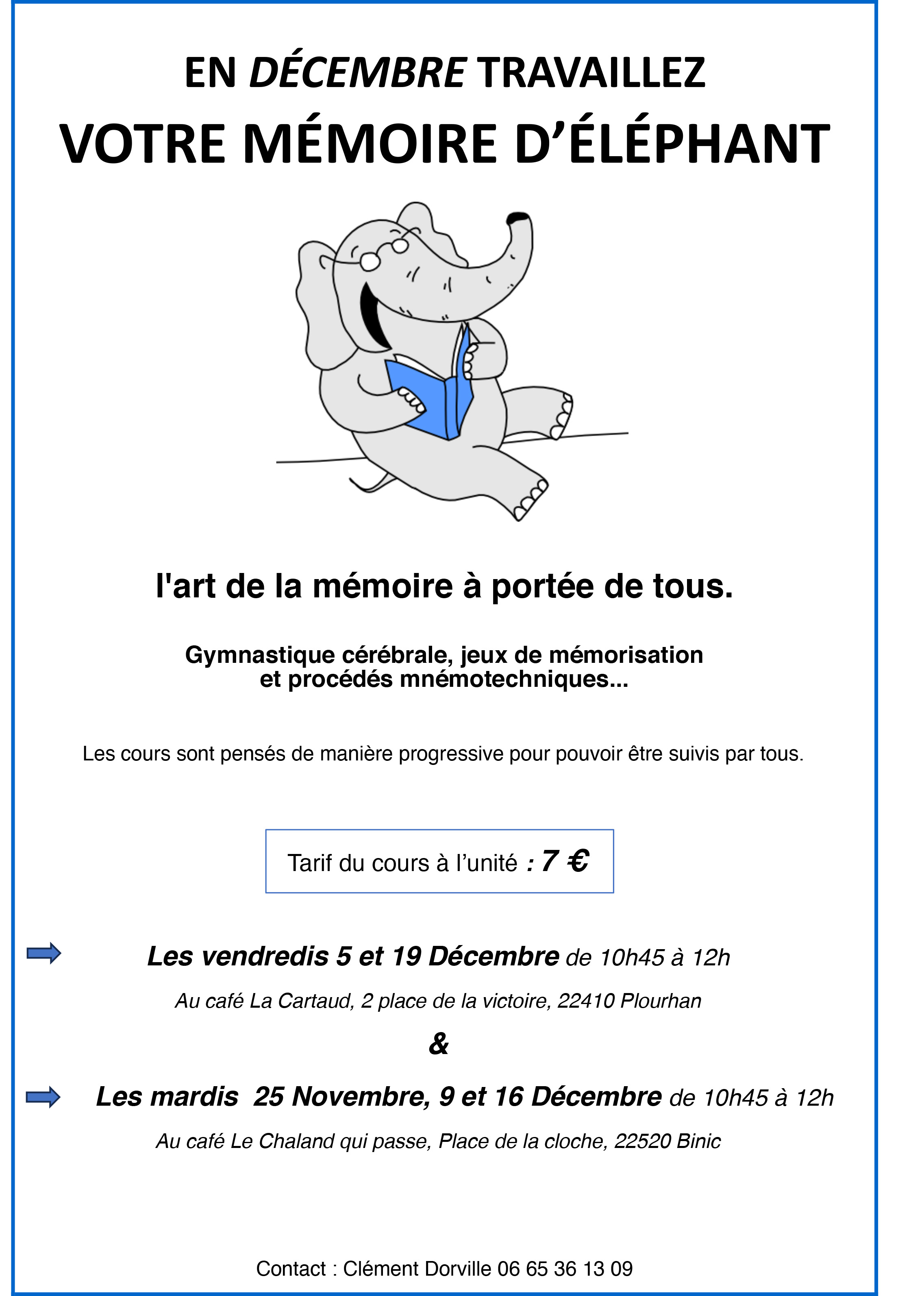 L’art de la mémoire à portée de tous. Gymnastique cérébrale, jeux de mémorisation et procédés mnémotechniques…Les cours sont pensés de manière progressive pour pouvoir être suivis par tous. Tarif du cours à l’unité : 7 €, Clément Dorville 06 65 36 13 09