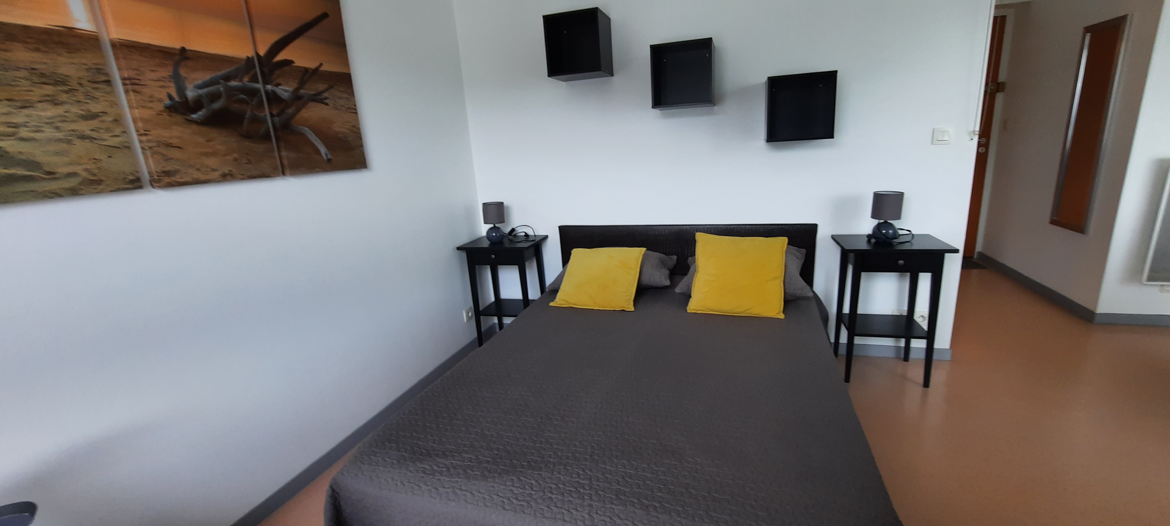 Pièce à vivre avec kitchenette équipée (micro-onde, mini four…), salle à manger et chambre avec lit double. Salle de bain douche et WC. Literie neuve.